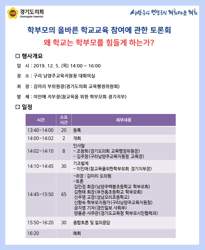 제목: “학부모의 올바른 학교교육 참여에 관한 토론회 - 왜 학교는 학부모를 힘들게 하는가?”