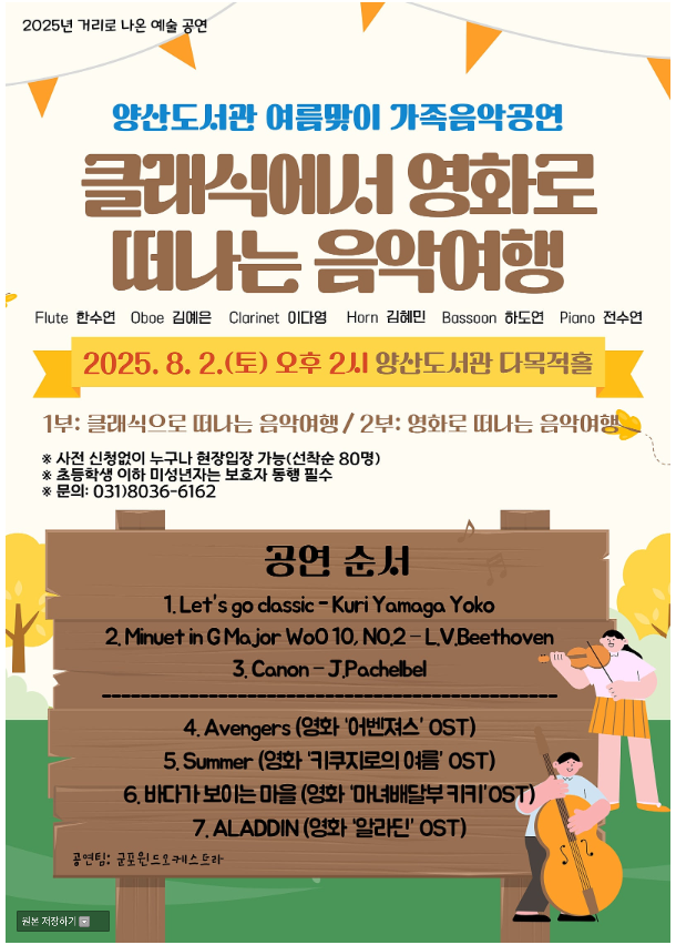 [양산도서관] 여름맞이 가족음악회 「클래식에서 영화로 떠나는 음악여행」 안내