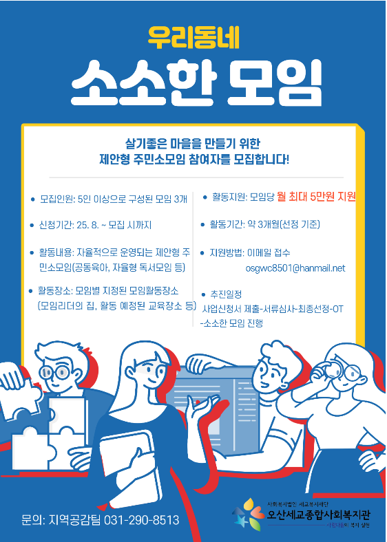 [오산시세교종합사회복지관] 2025년 하반기 신규 우리동네 소소한 모임 모집(매월 활동비 5만원 지급)
