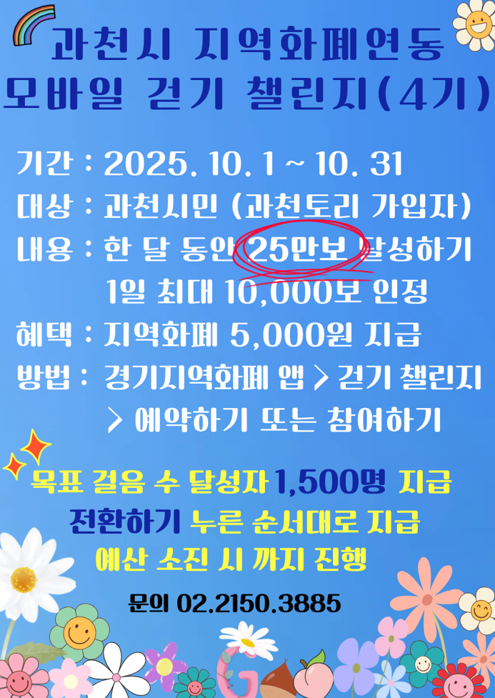 경기지역화폐 앱에서 걷기 챌린지에 참여하고 걷기 실천으로 적립한 마일리지를 지역화폐(과천토리)로 전환하여 현금처럼 쓸 수 있는 원스톱 건강생활실천 서비스에 많은 분들의 참여 바랍니다.
