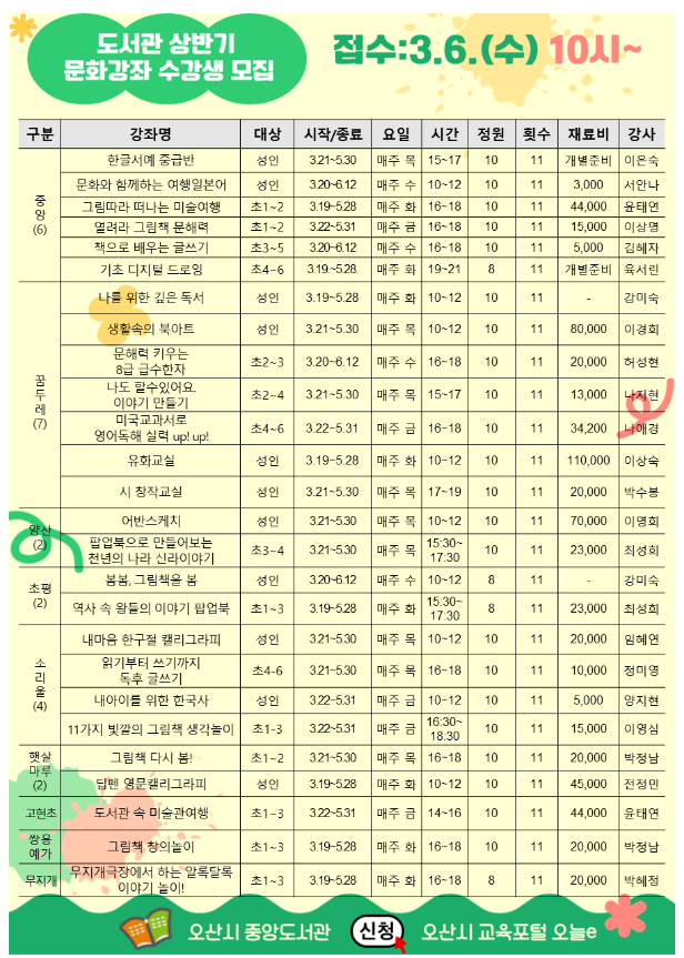 2024년 오산시 도서관 상반기 문화강좌 수강생 모집 공고